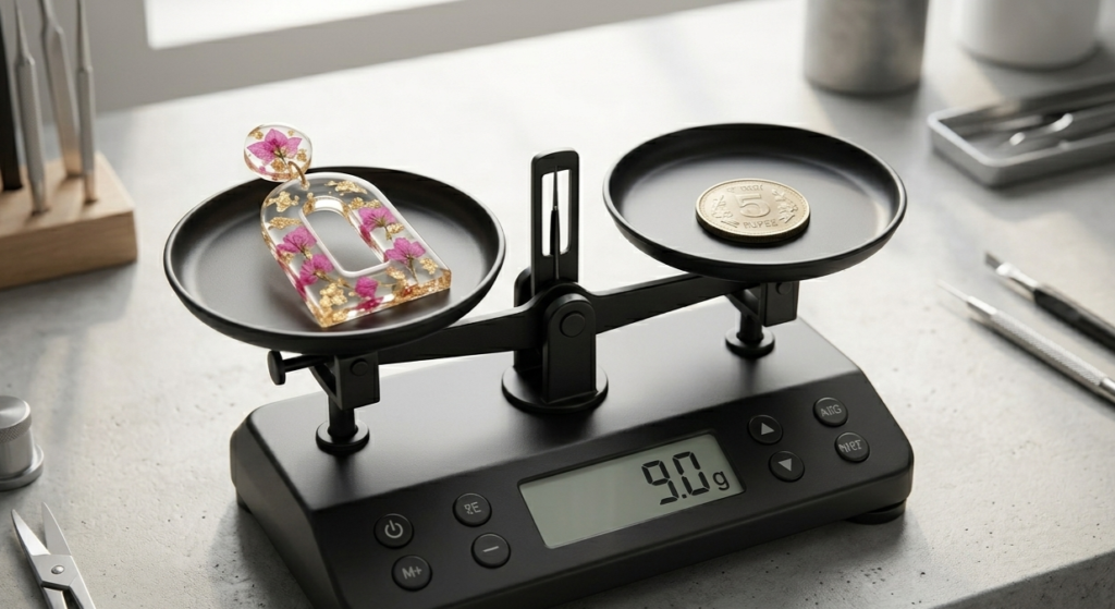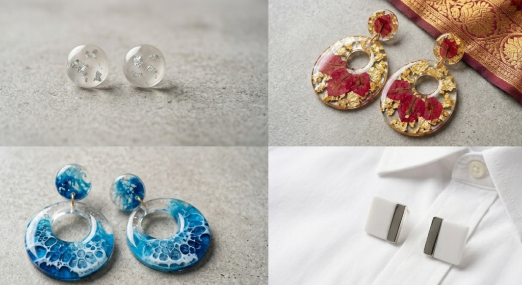 Resin is a liquid polymer that, when cured, mimics the optical clarity of glass and the hardness of stone—but at a fraction of the weight. This “Volume without Mass” allows designers to create oversized, architectural, and bold dangles that weigh less than a standard 5-rupee coin.